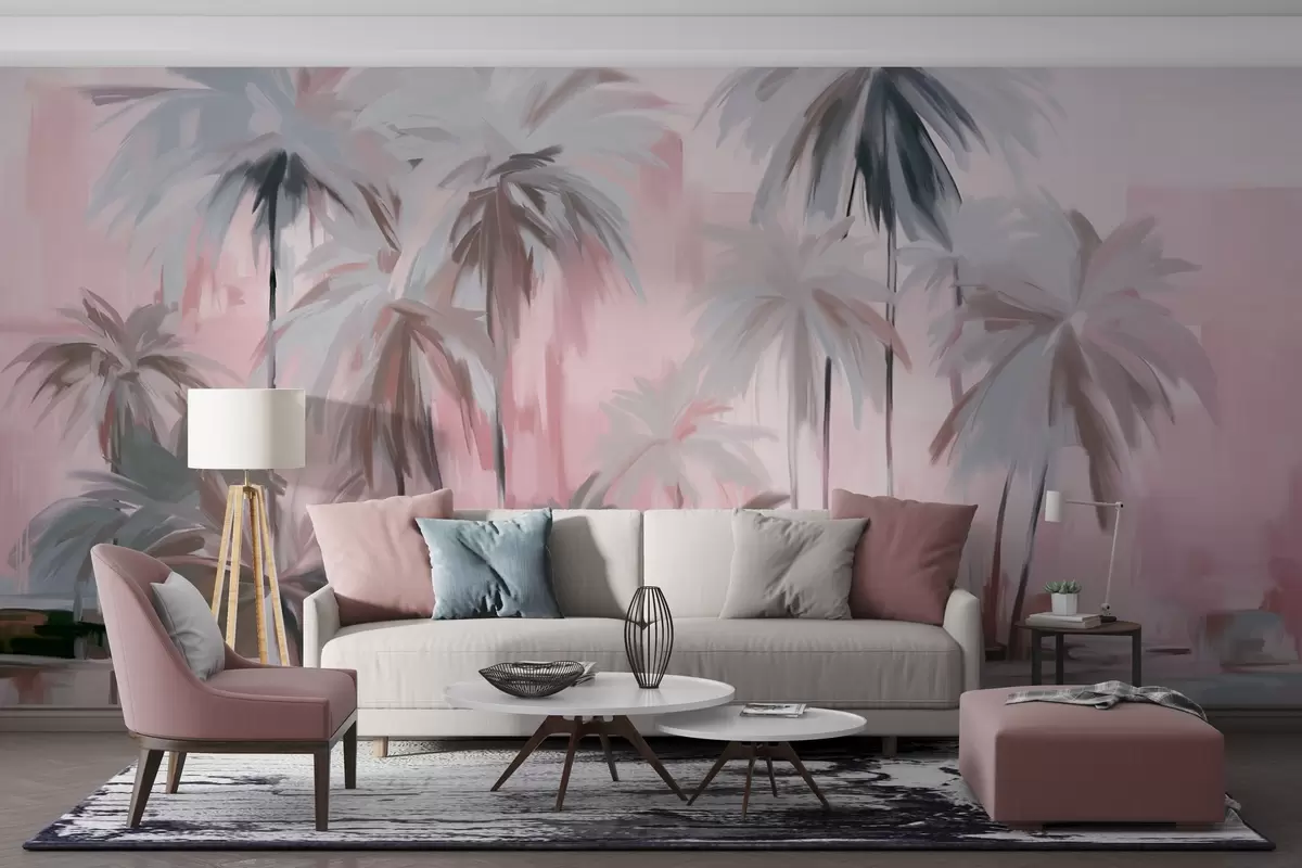 Fotomurales Palmeras tropicales abstractas minimalistas en tonos pastel, sobre un fondo de tonos rosas y grises apagados Nr. w09212v1