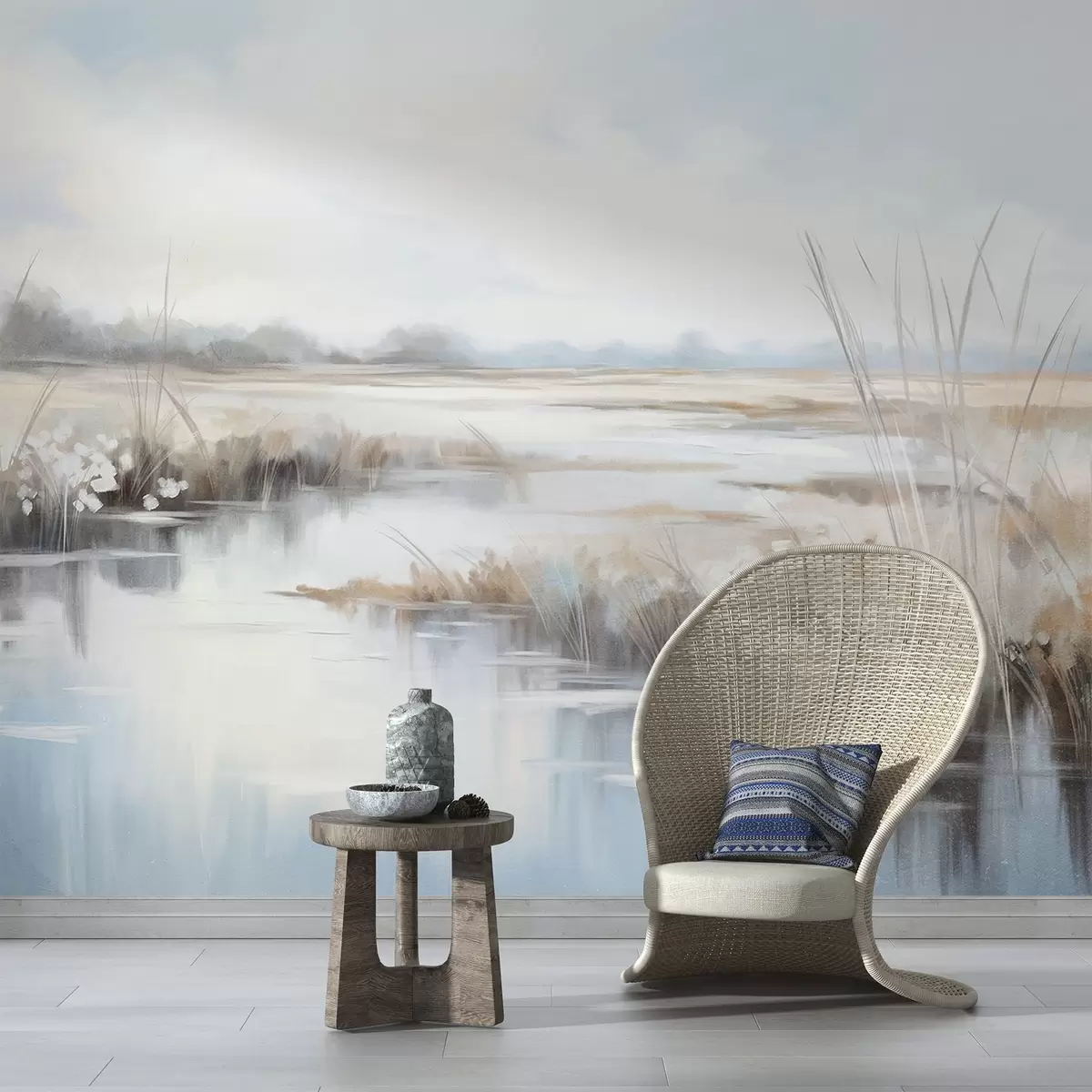 Fotomurales Paisaje tranquilo y texturizado con hierbas altas y aguas tranquilas, suaves colores pastel, árboles lejanos en el horizonte Nr. w09213
