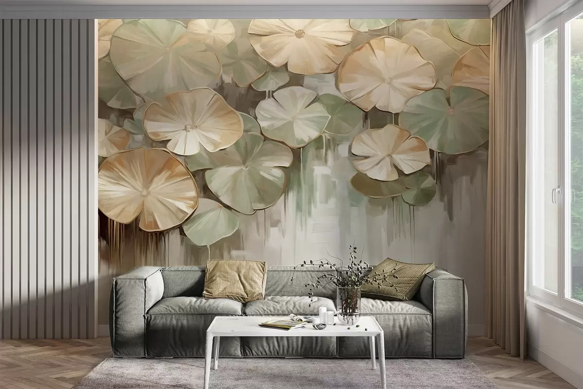 Fotomurales Nenúfares texturizados con colores verde y beige en un estanque, el fondo es una mezcla borrosa de blanco, verde y marrón Nr. w09255