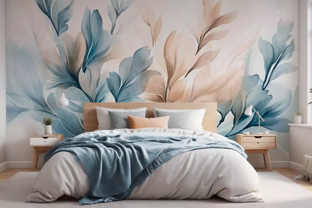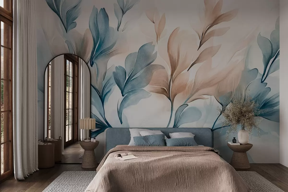 Fotomurales Hojas abstractas azules y marrones con pinceladas visibles , ligeras y texturizadas, paleta de colores suaves, efecto acuarela Nr. w09313