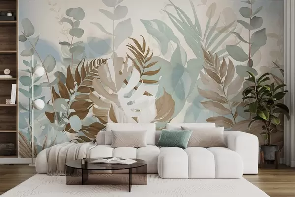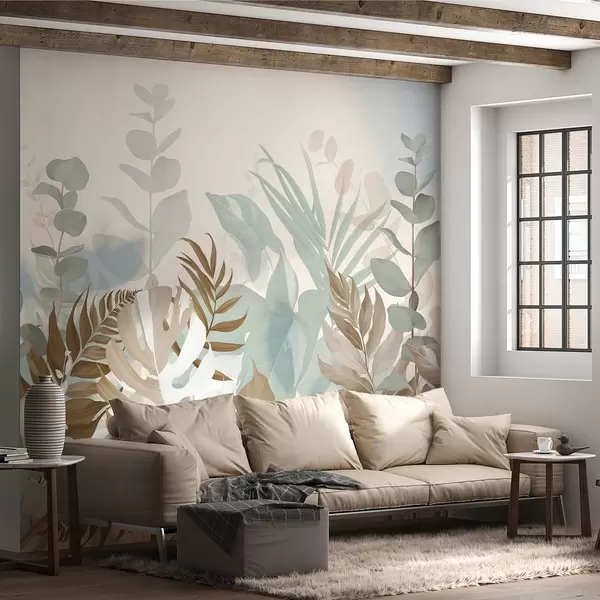 Fotomurales Plantas pastel helechos, monstera y eucalipto, fondo de textura ligera, iluminación suave, tranquilo , ilustración botánica Nr. w09316v1