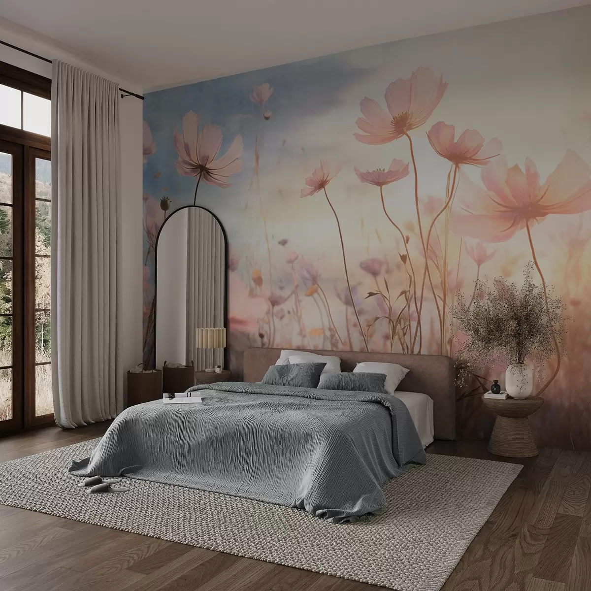 Fotomurales Un campo de flores de textura rosa con tallos largos, contra un suave cielo azul y amarillo, creando una atmósfera de ensueño Nr. w09320