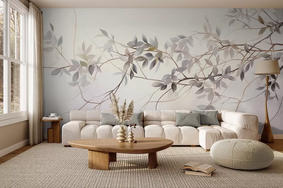 Fotomurales Ramas de textura delicada con hojas en tonos grises, morados y verdes apagados sobre un fondo suave y difuminado. Nr. w09336