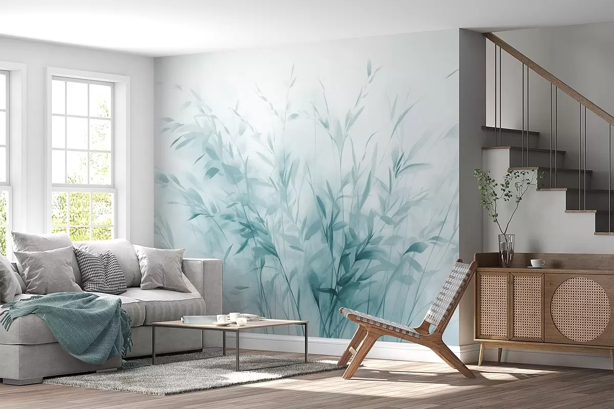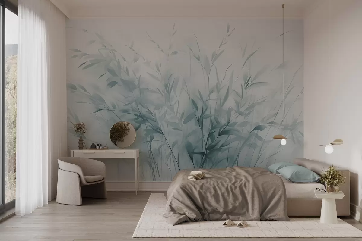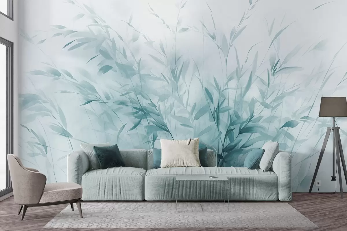 Fotomurales Hierba y maleza con hojas y tallos finos, colores azul claro, pinceladas suaves y delicadas, estampado minimalista Nr. w09342v1