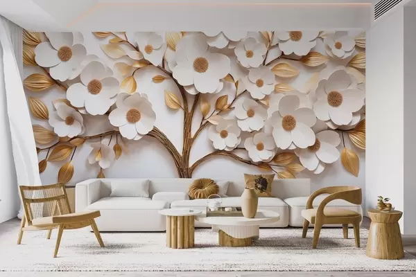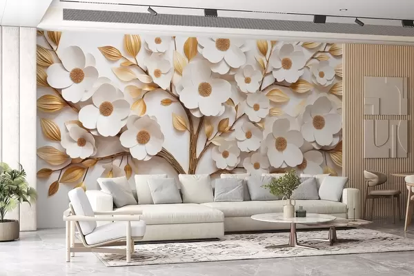 Fotomurales Árbol con flores blancas e imitación de hojas en relieve Nr. w09348