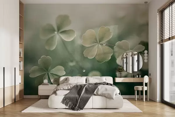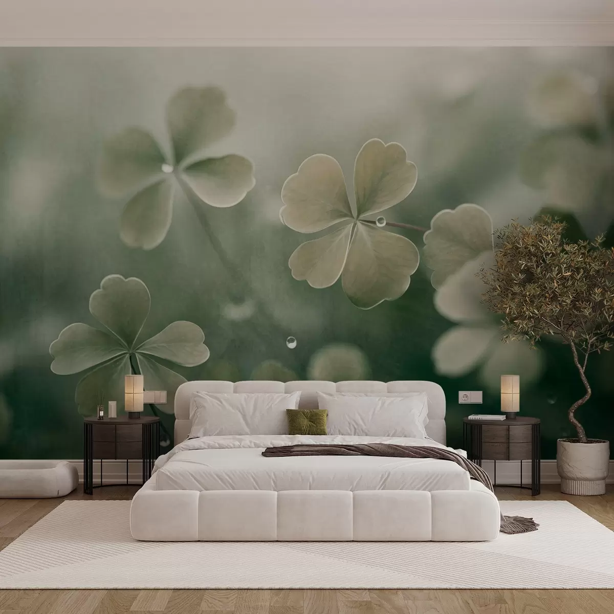 Fotomurales Tréboles de cuatro hojas con gotas de agua, color verde claro, enfoque suave, fondo borroso, impresión con textura Nr. w09376