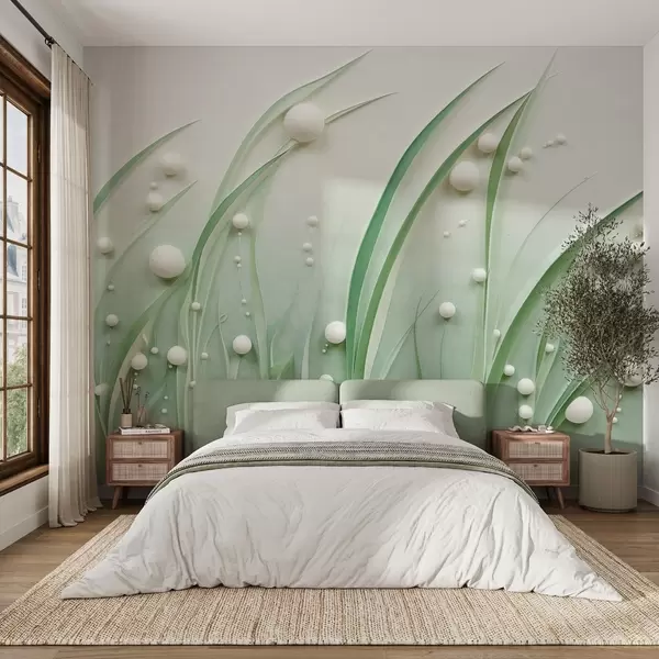 Fotomurales Hierba verde abstracta con esferas blancas, fondo verde claro, texturizado, líneas limpias, estilo minimalista Nr. w09382