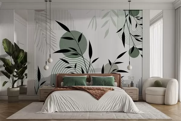Fotomurales Estampado abstracto texturizado con formas geométricas, círculos y arcos y plantas negras y verdes sobre fondo blanco Nr. w09384