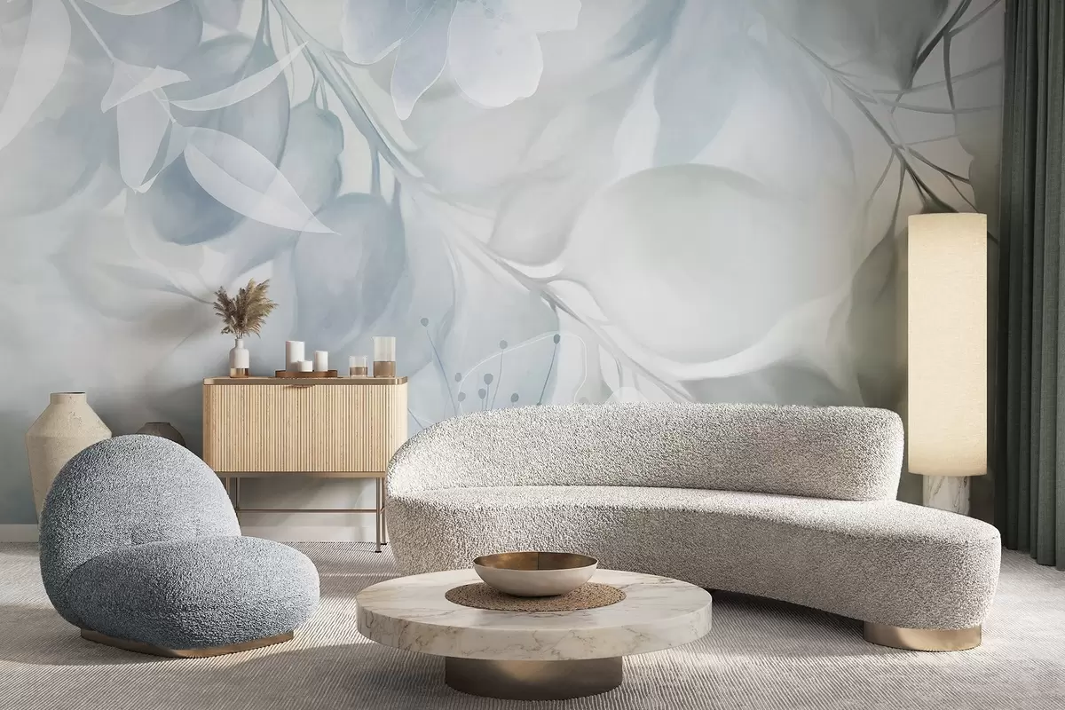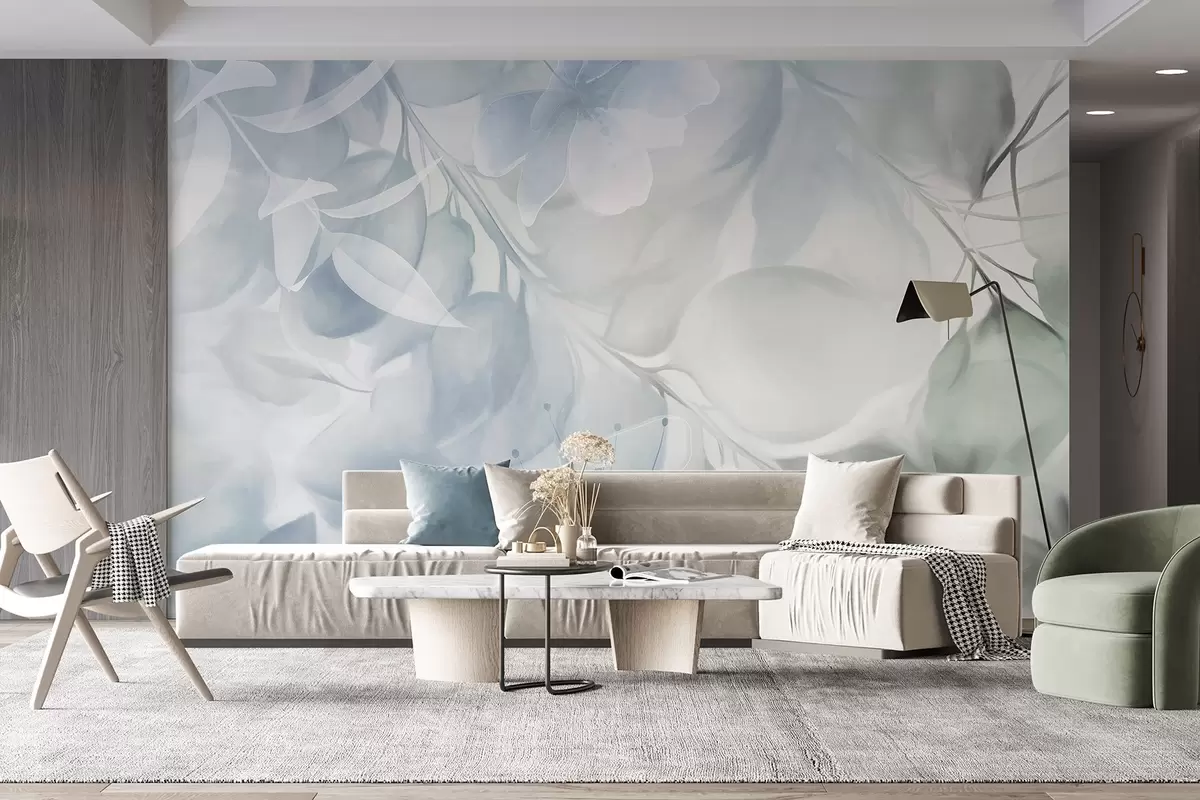 Fotomurales Arte floral con flores, hojas y ramas en tonos azules y verdes apagados, colores pastel suaves y efecto textura acuarela Nr. w09397v1