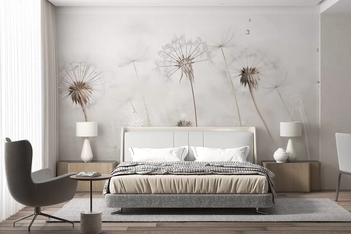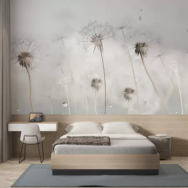 Fotomurales Dientes de león con gotas de agua, fondo blanco, primer plano, luz suave, naturaleza, botánico, etéreo, delicado, minimalista Nr. w09399