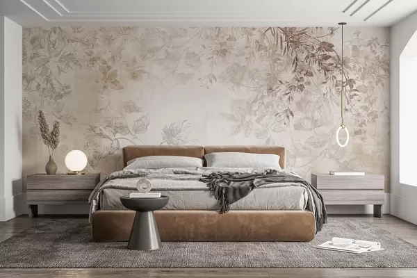 Fotomurales Arte floral vintage con textura, ilustraciones de delicadas flores y hojas de jardín en estilo dibujo, suaves tonos pastel beige y sepia Nr. w09402