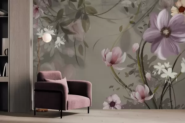 Fotomurales Flores rosas y blancas con tallos y hojas marrones, iluminación suave, colores apagados, arreglo floral Nr. w09417