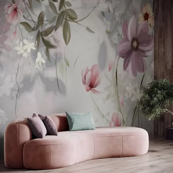 Fotomurales Flores rosas y blancas con tallos y hojas verdes, iluminación suave, colores apagados, arreglo floral Nr. w09417v1