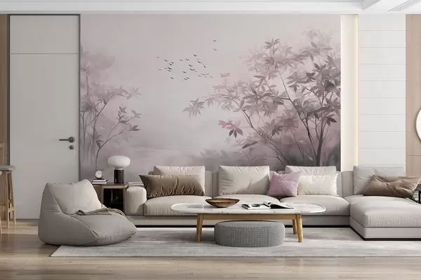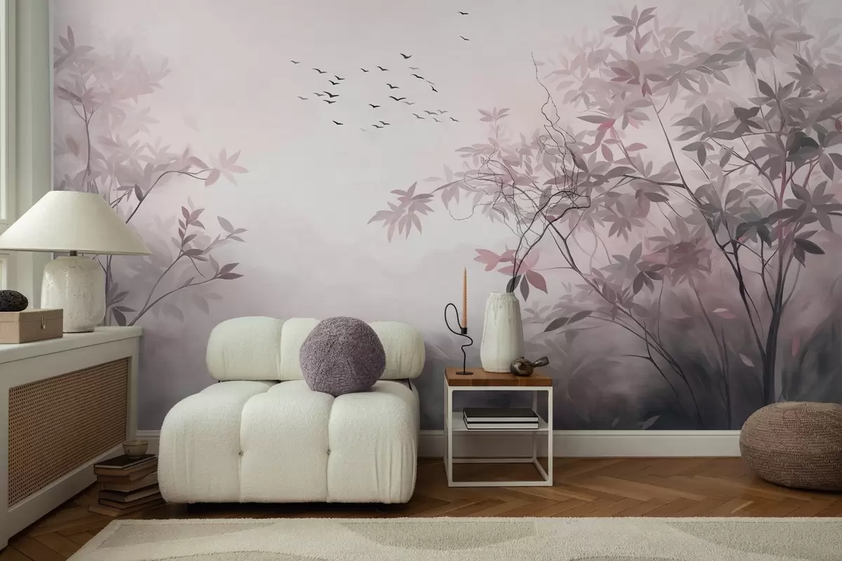Fotomurales Paisaje texturizado con árboles y una bandada de pájaros volando en el cielo, colores pastel, escena natural Nr. w09418v1