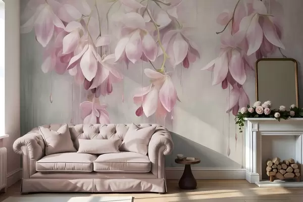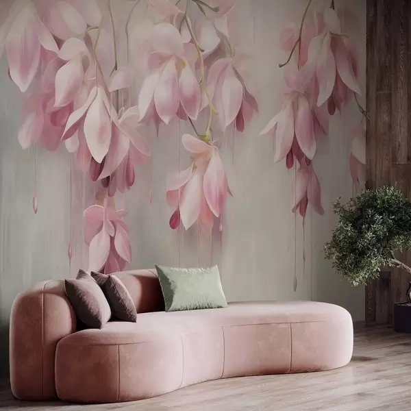 Fotomurales Flores rosas colgantes, fondo gris claro, arreglo floral con textura, arte botánico, colores pastel Nr. w09471