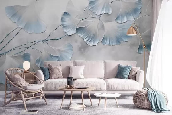 Fotomurales Hojas de ginkgo biloba con bordes azules en una rama, fondo gris texturizado, diseño elegante y minimalista Nr. w09472v1