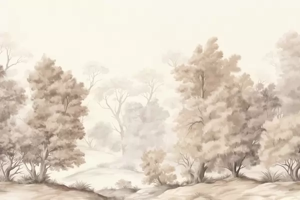 Fotomurales Pintura paisajística texturizada que imita un bosque con árboles altos y hierba, colores apagados y suaves, escena relajante Nr. w09474