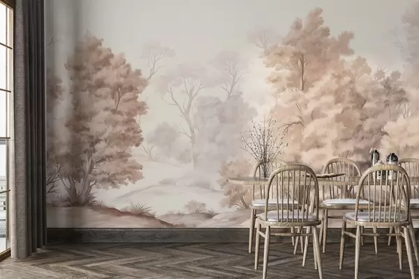Fotomurales Pintura paisajística texturizada que imita un bosque con árboles altos y hierba, colores apagados y suaves, escena relajante Nr. w09474