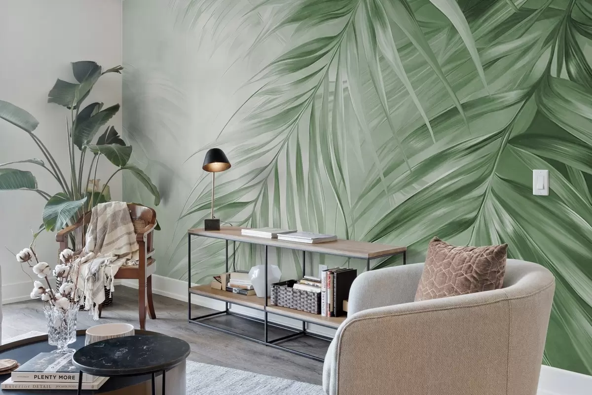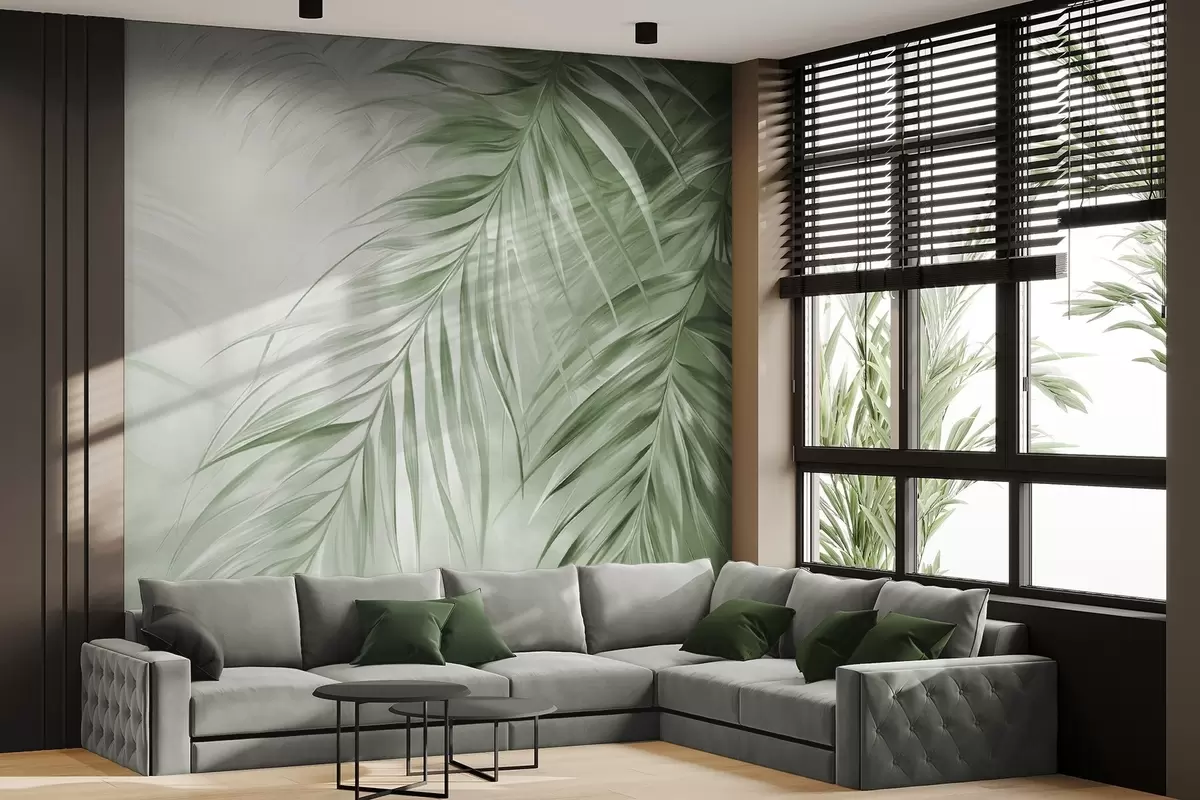 Fotomurales Hojas de palmera con tonos verdes, fondo con textura ligera y colores suaves, elegante estilo tropical Nr. w09475v2