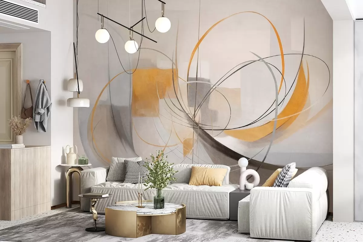 Fotomurales Estilo pictórico moderno abstracto con texturas, líneas curvas y formas geométricas en tonos grises, blancos y naranjas Nr. w09476