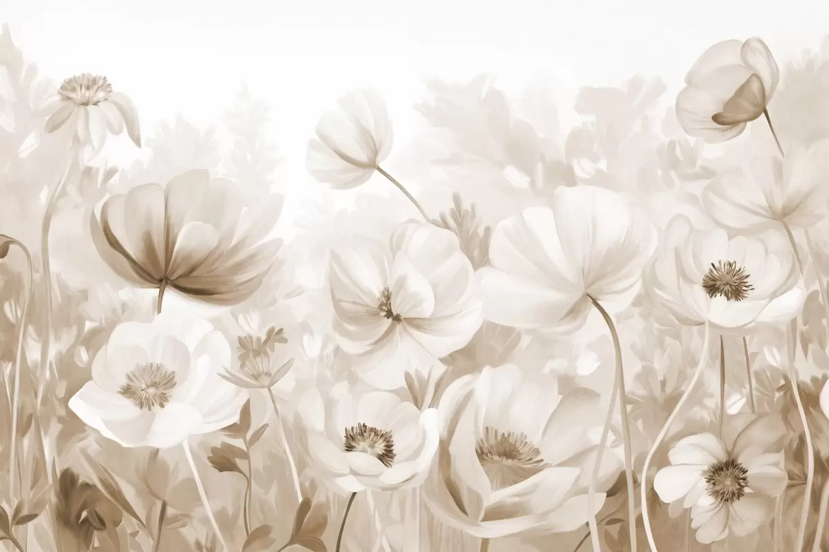 Fotomurales Un campo de flores beige con delicados pétalos y suaves hojas marrones, en un estilo acuarela de ensueño y texturizado Nr. w09481v1