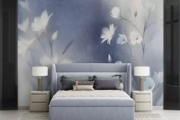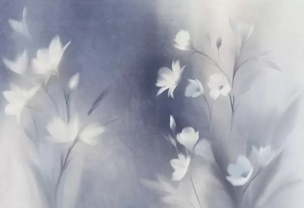 Fotomurales Flores blancas con textura y tallos largos, capullos suaves sobre un fondo difuminado de tonos azules y blancos Nr. w09484