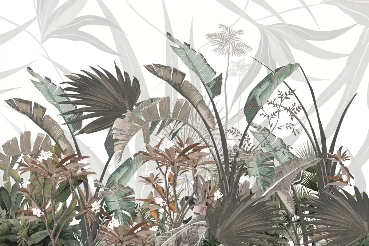 Fotomurales Hojas tropicales con textura y flores, palmeras, flores de plumeria, colores pastel, fondo blanco, selva Nr. w09488
