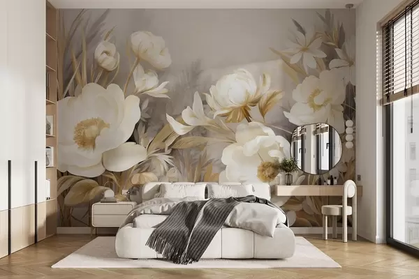 Fotomurales Peonías blancas y amarillas y otras flores con hierba alta y hojas en un estilo suave y pictórico con textura Nr. w09494