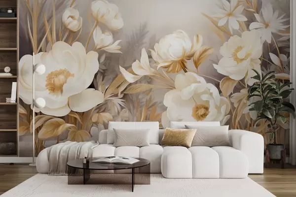 Fotomurales Peonías blancas y amarillas y otras flores con hierba alta y hojas en un estilo suave y pictórico con textura Nr. w09494