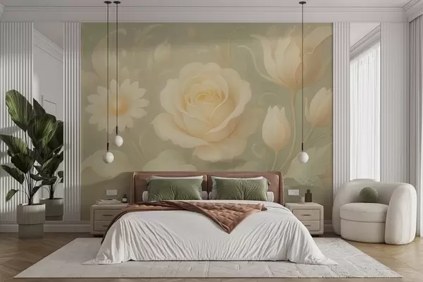 Fotomurales Delicada composición vintage con rosas beige sobre fondo verde claro. Nr. w09499