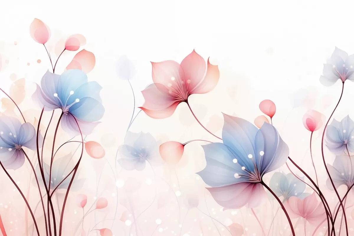 Fotomurales Delicadas flores rosa y azul: flora etérea sobre un fondo blanco acuarelado. Nr. w09507