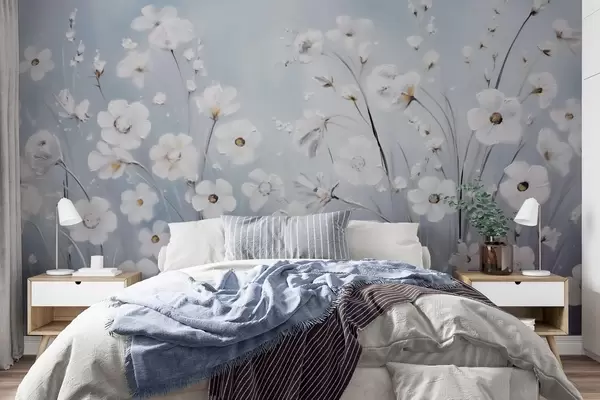Fotomurales Flores blancas contra un cielo azul en estilo pintura al óleo Nr. w09516