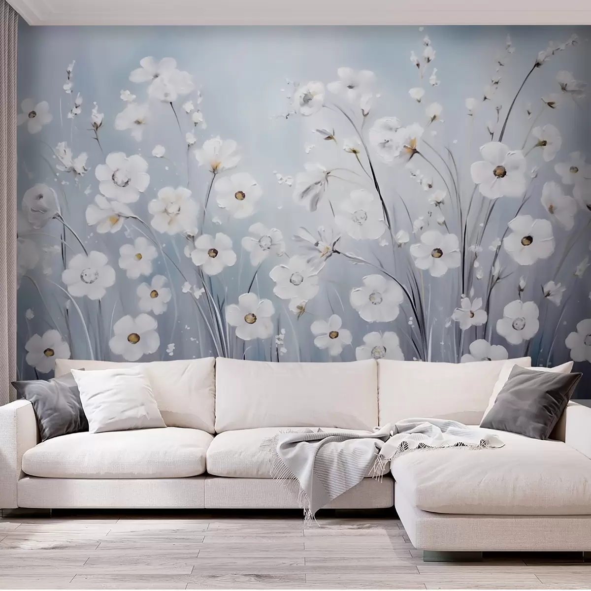 Fotomurales Flores blancas contra un cielo azul en estilo pintura al óleo Nr. w09516