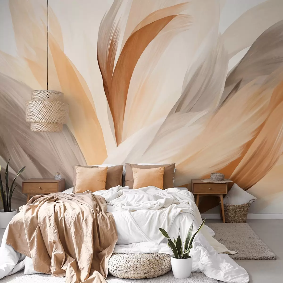 Fotomurales Plumas abstractas con textura en marrón, blanco y gris y varios tonos, superpuestas sobre un fondo blanco. Nr. w09531