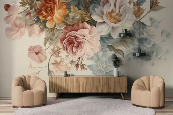 Fotomurales Arreglo floral vintage con rosas, peonías y otras flores con textura y follaje, sobre un fondo claro Nr. w09532