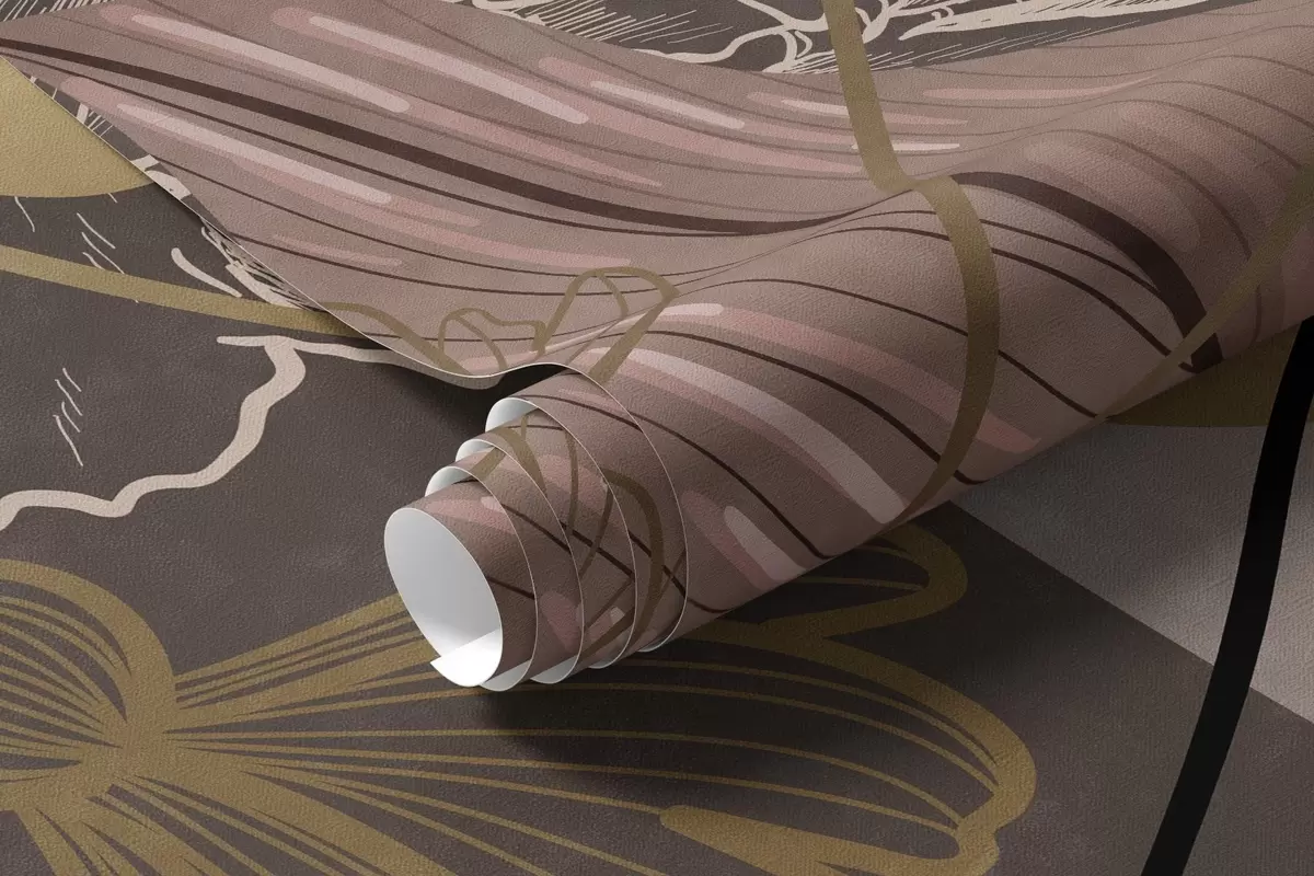 Fotomurales Estampado floral abstracto con hojas grandes en tonos rosa apagado y marrón, con finas líneas negras y contornos florales blancos. Nr. w09544