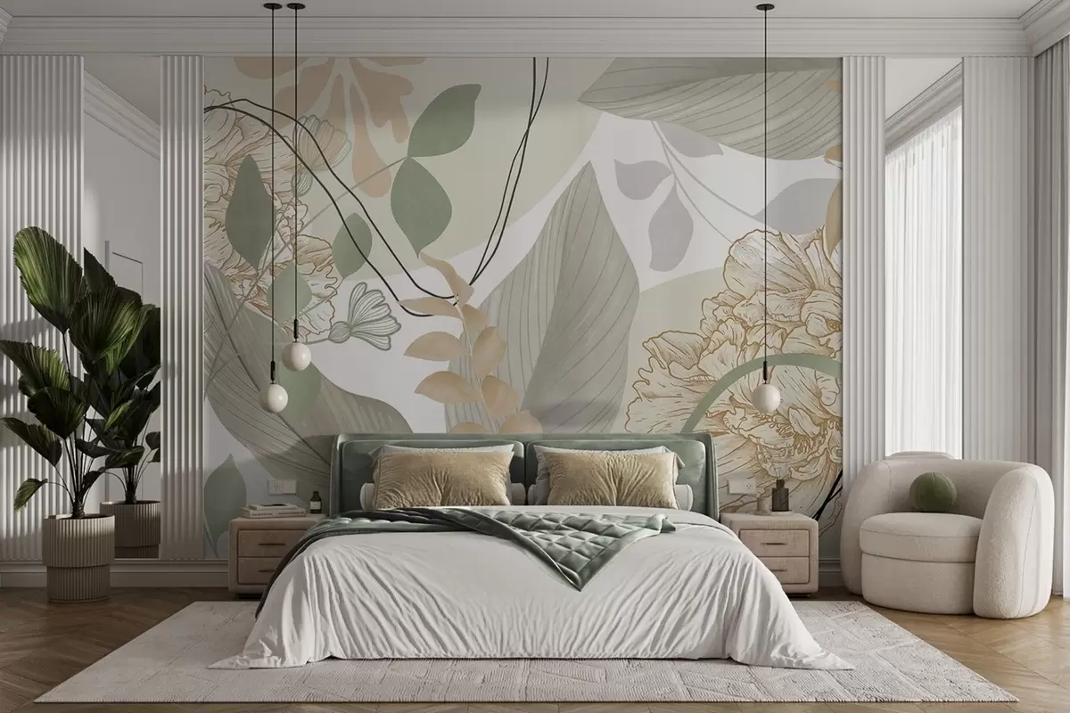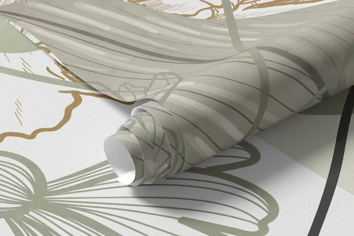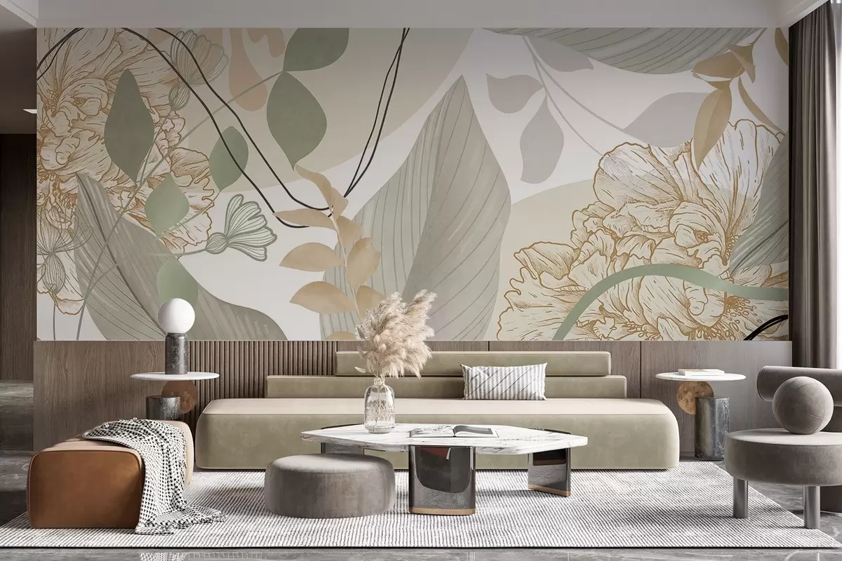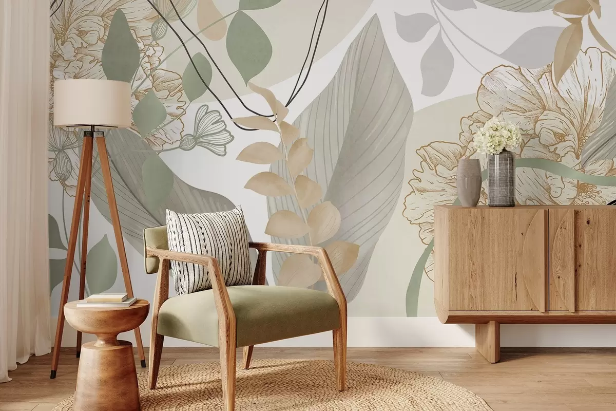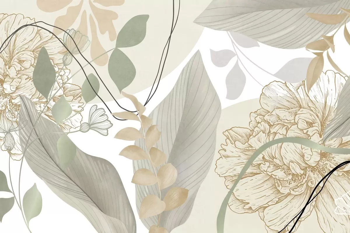 Fotomurales Estampado floral abstracto con hojas grandes en tonos verdes y amarillos apagados, con finas líneas negras y contornos florales blancos. Nr. w09544v2