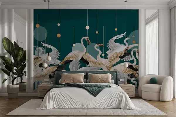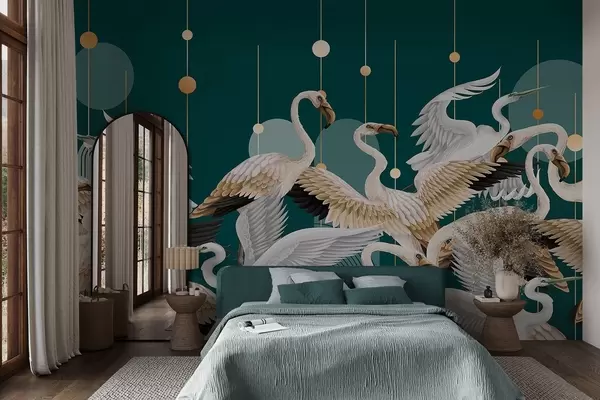 Fotomurales Una bandada de flamencos blancos con delicadas alas, sobre un fondo verde azulado oscuro con líneas y círculos amarillos Nr. w09546