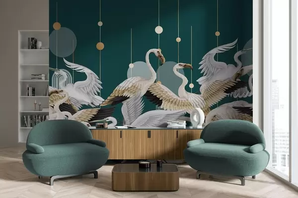 Fotomurales Una bandada de flamencos blancos con delicadas alas, sobre un fondo verde azulado oscuro con líneas y círculos amarillos Nr. w09546
