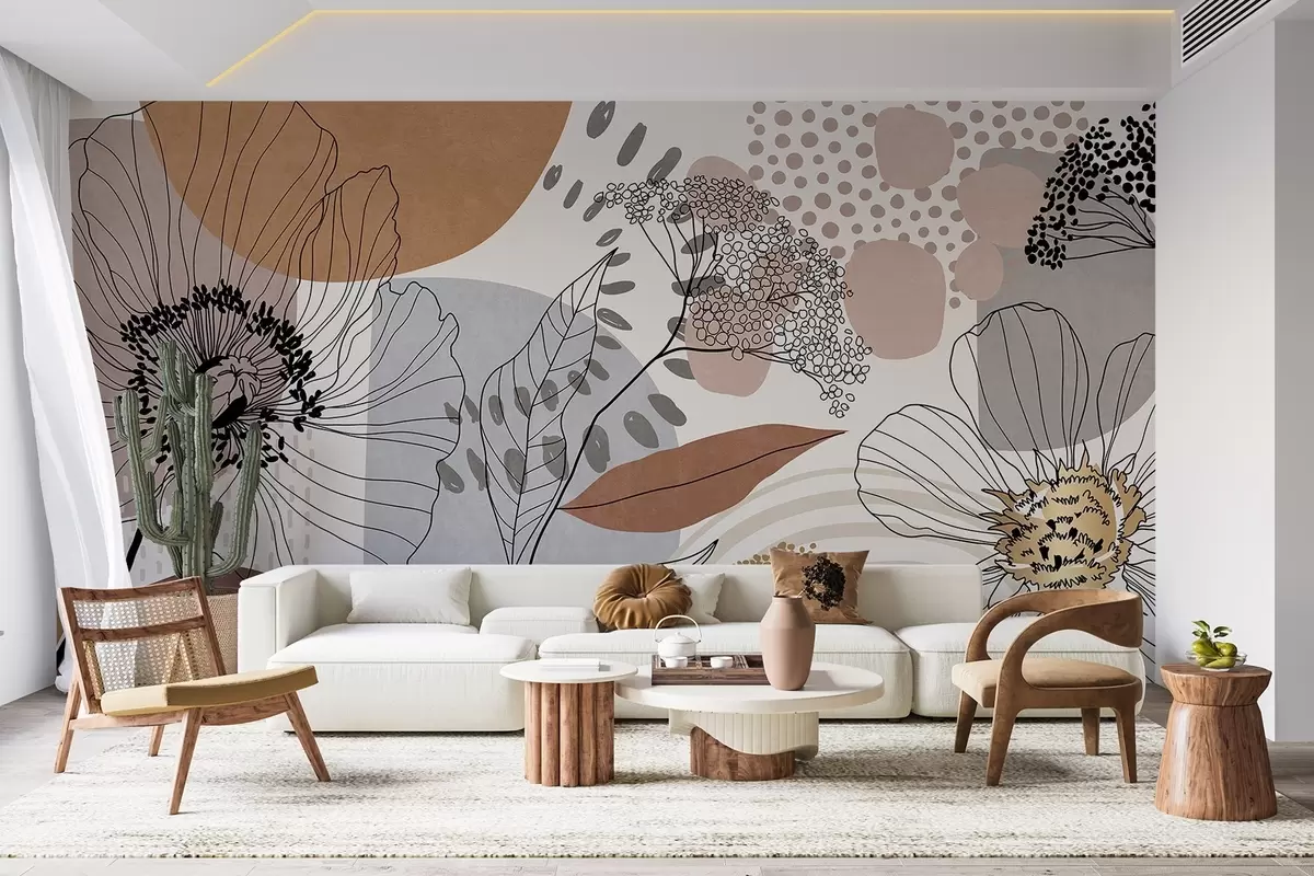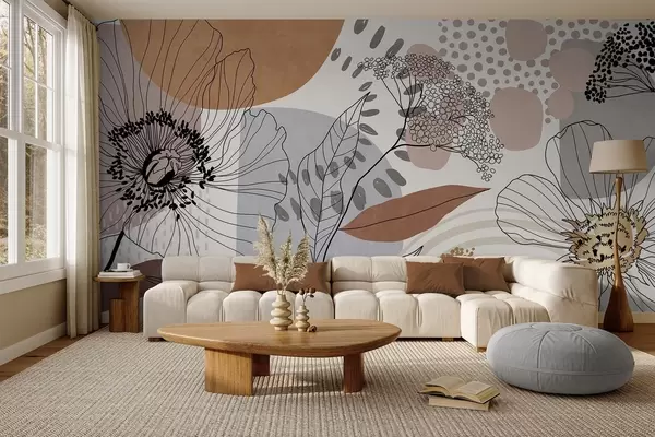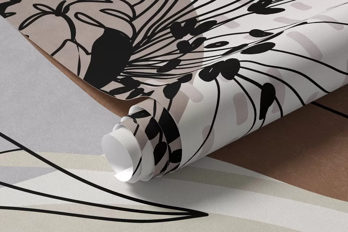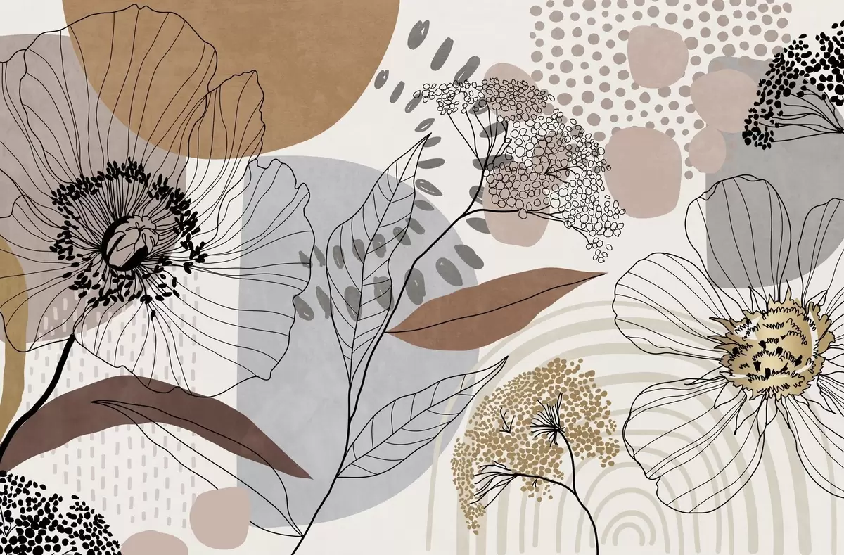 Fotomurales Estampado abstracto con textura floral, flores de trazo fino, hojas y formas orgánicas en tonos apagados de marrón, beige y gris. Nr. w09548