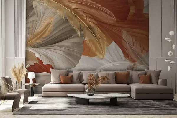 Fotomurales Formas abstractas grandes y fluidas con textura en colores crema y óxido con delicadas plumas amarillas, beige y marrones Nr. w09549