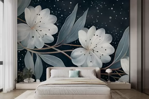 murales de pared Flores blancas con textura fantástica, rodeadas de hojas y ramas azul verdosas sobre un fondo oscuro w09551
