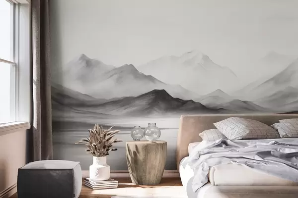 Fotomurales Un paisaje monocromático con textura, montañas brumosas y un lago en primer plano Nr. w09555