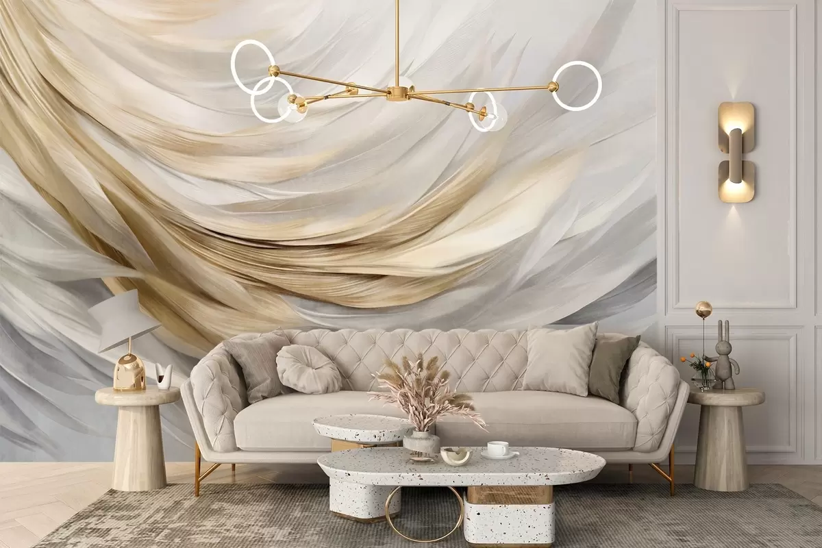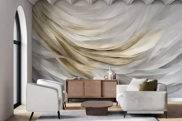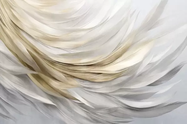 Fotomurales Plumas abstractas con textura en blanco, gris y amarillo, creando un patrón fluido y en capas sobre un fondo claro. Nr. w09557