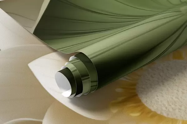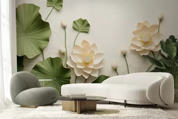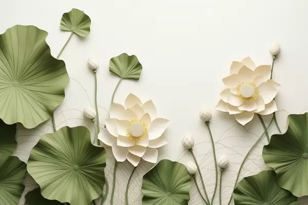 Fotomurales Flores de loto en 3D con hojas verdes texturizadas, estilo minimalista. Nr. w09560