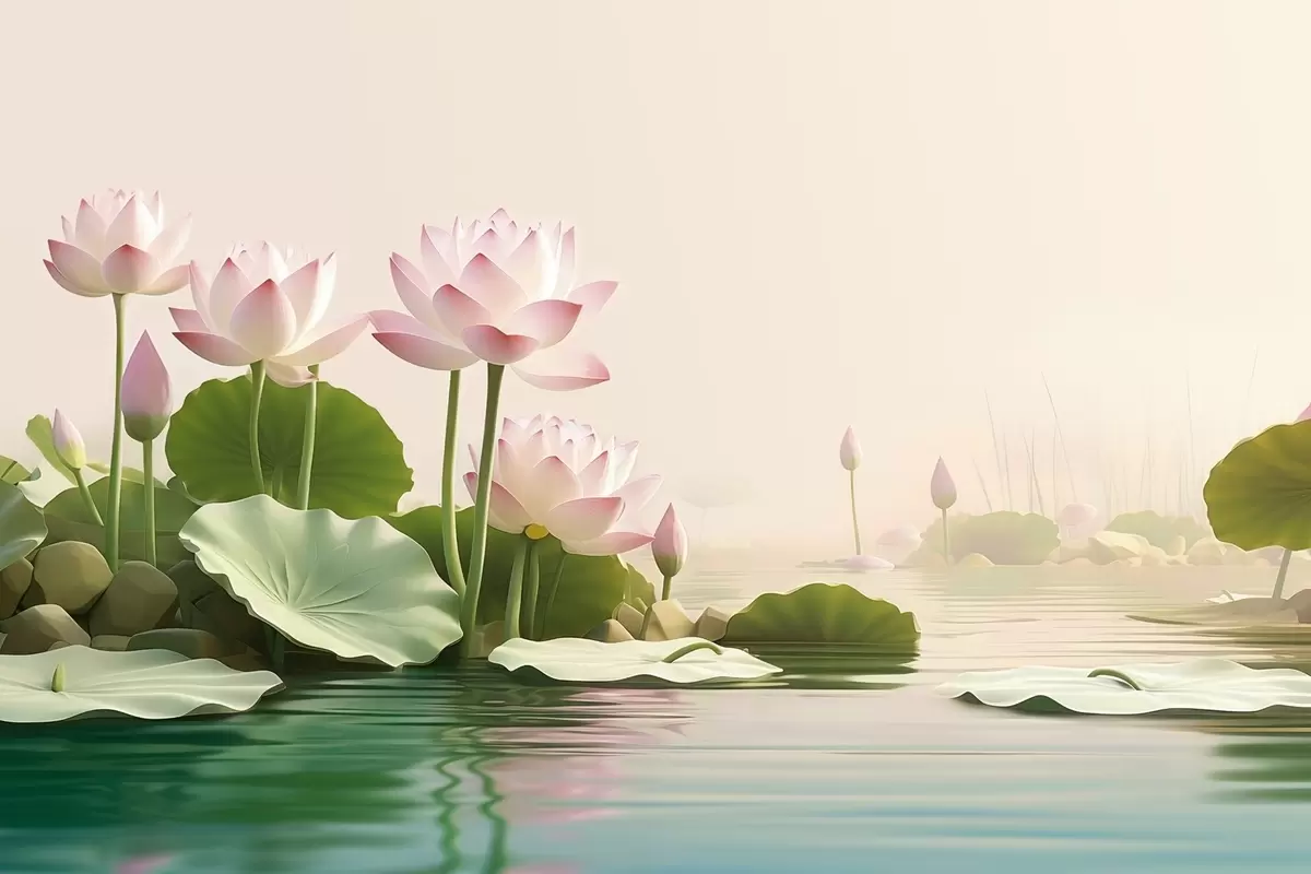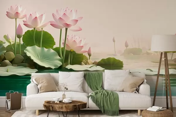 Fotomurales Flores de loto rosadas sobre el agua, un tranquilo paisaje tropical. Nr. w09561