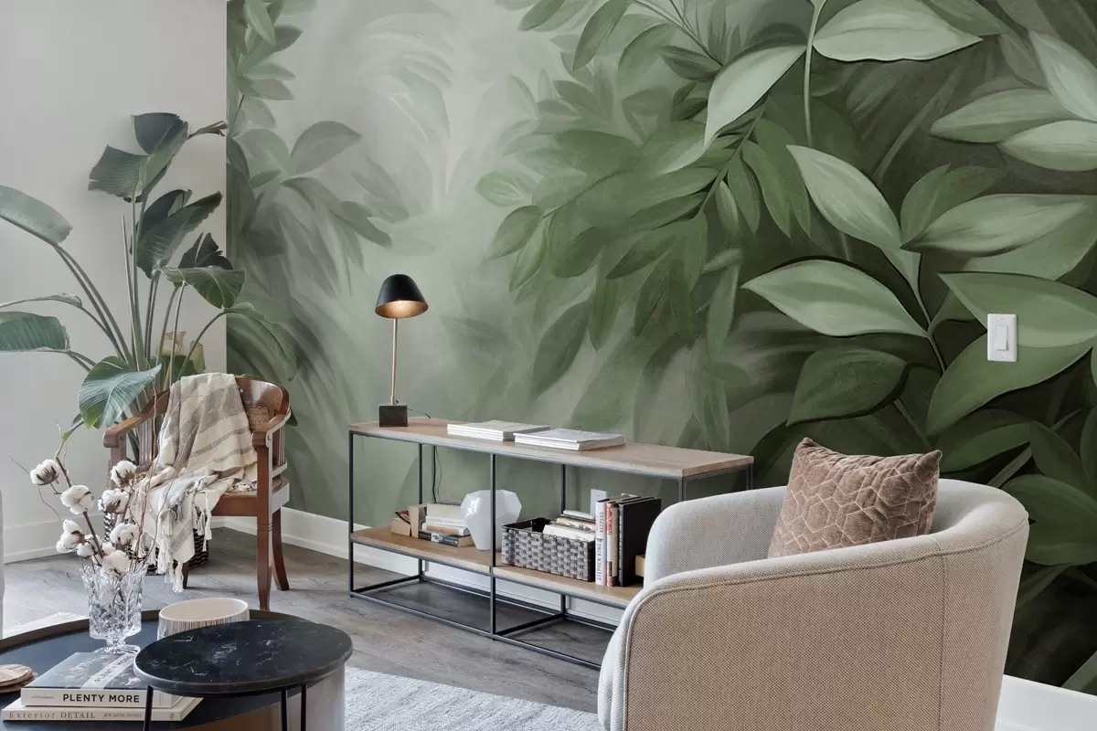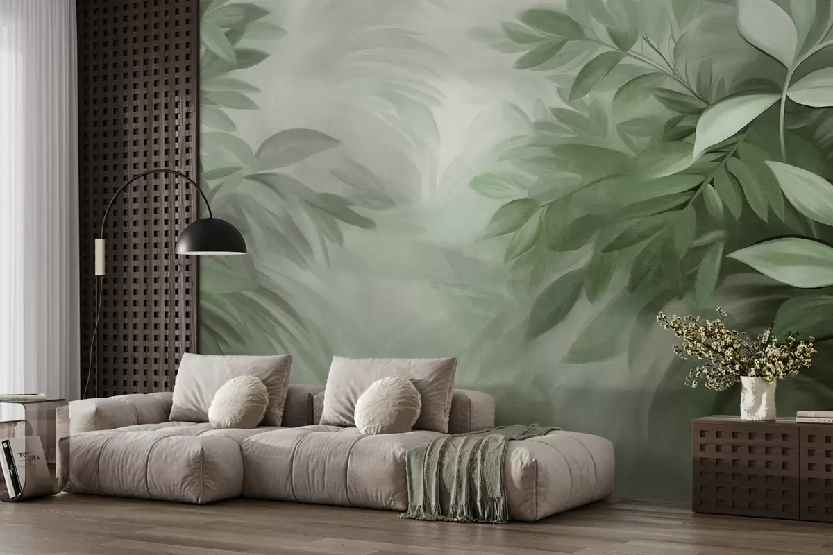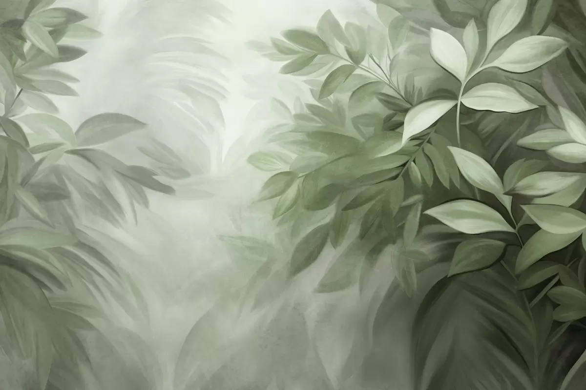 Fotomurales Hojas verdes y grises con un follaje de textura suave y difuminada, en un estilo pictórico con pinceladas visibles. Nr. w09584v1