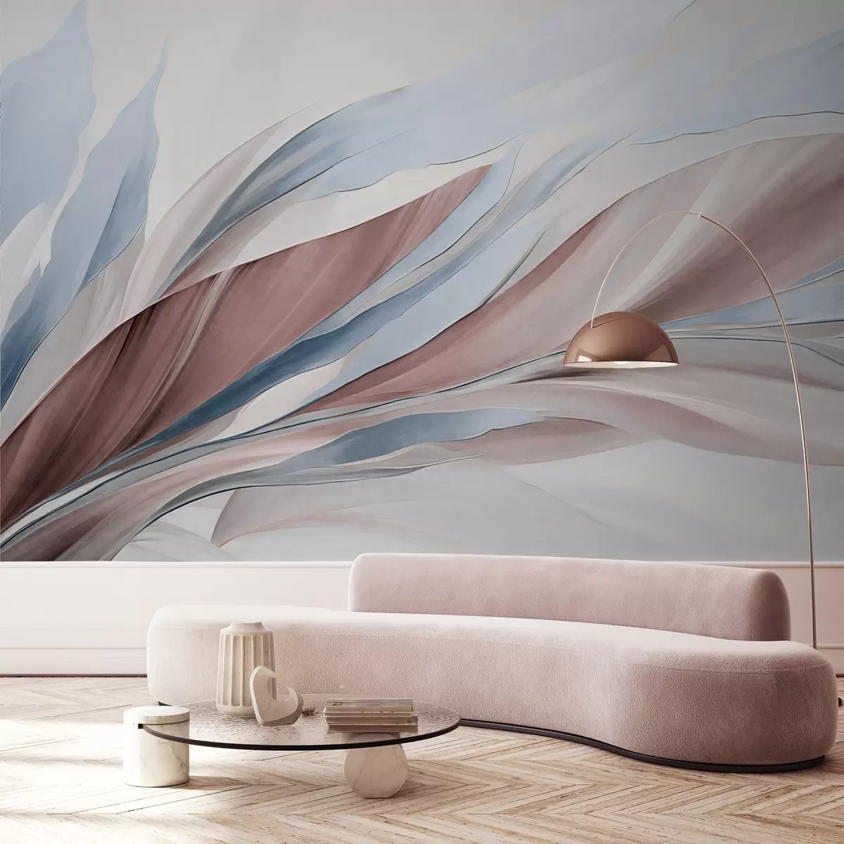 Fotomurales Ondas abstractas fluidas de color azul y marrón, con formas y líneas finas, sobre un fondo blanco, arte texturizado. Nr. w09585v1