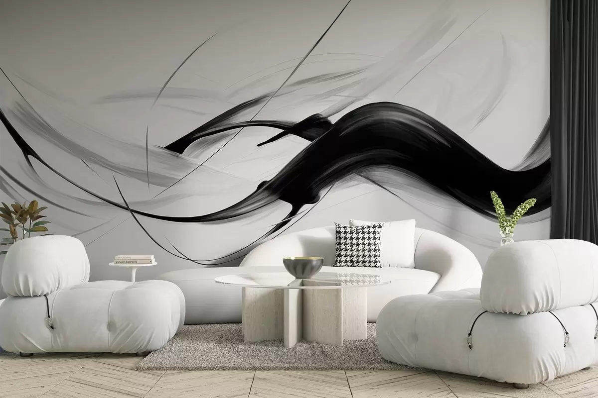 Fotomurales Pinceladas abstractas en blanco y negro con líneas finas que crean un diseño moderno sobre un fondo claro. Nr. w09605