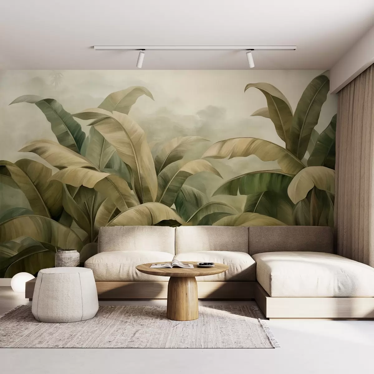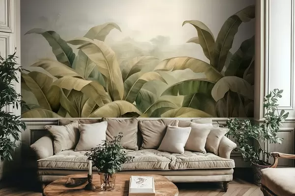 Fotomurales Paisaje selvático denso y texturizado con grandes hojas de plátano en tonos verdes y beige apagados. Nr. w09613